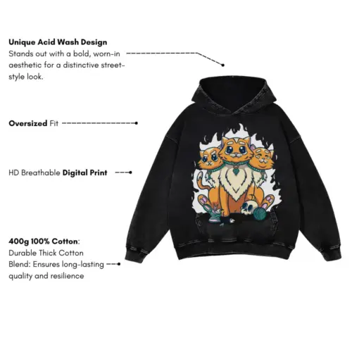 3 Head Cat Acid Wash Oversized Hoodie