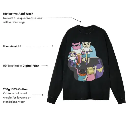 3 Scooter Cats Acid Wash Oversized Long Sleeve Shirt