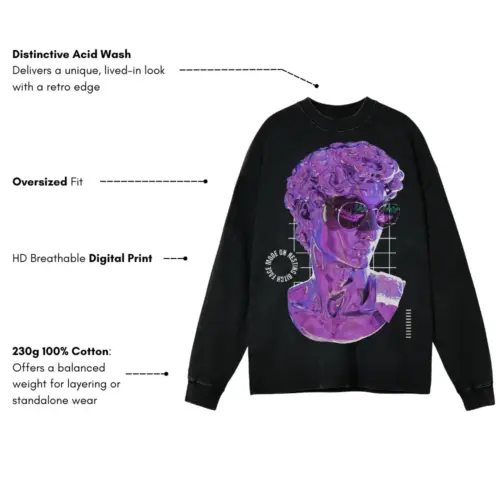 3D Liquid Bitch Face Acid Wash Oversized Long Sleeve Shirt