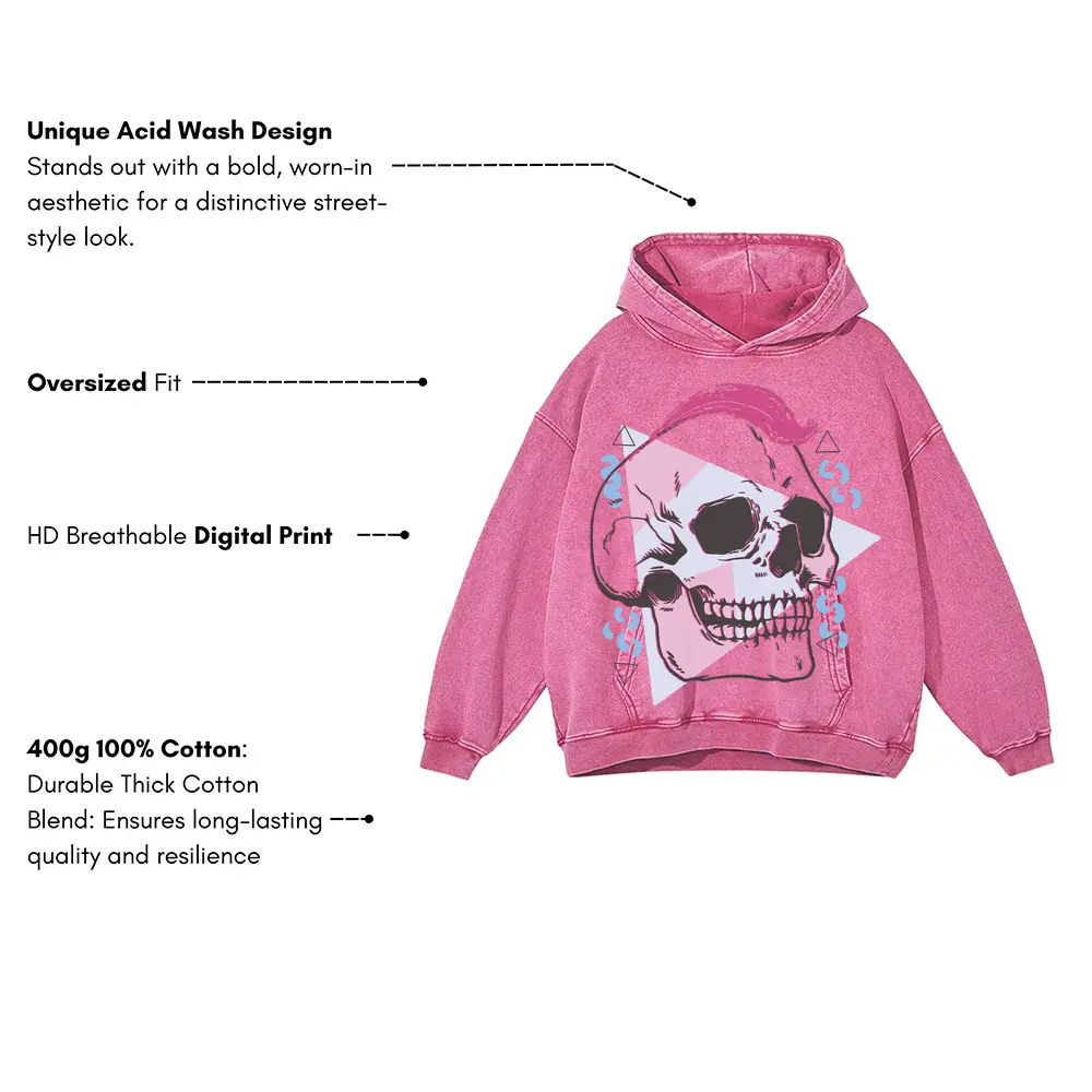 90 S Skull Design Acid Wash Oversized Pink Hoodie