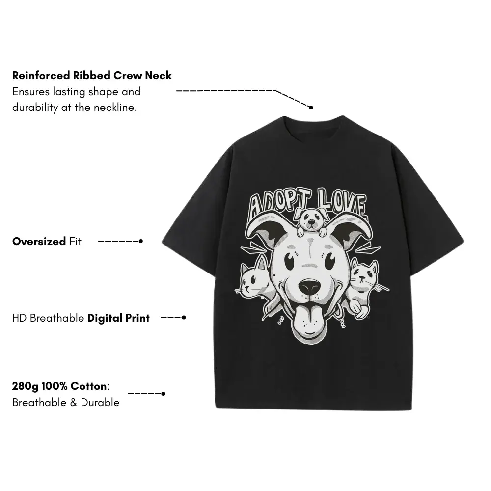 Adopt Cats Dogs Heavyweight Oversized Black Graphic Tee