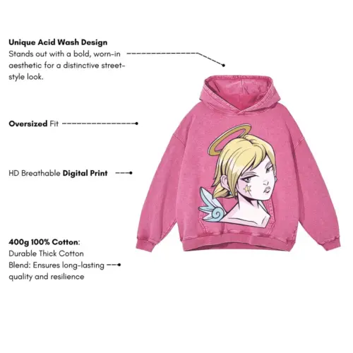 Angel Girl Anime Acid Wash Oversized Pink Hoodie