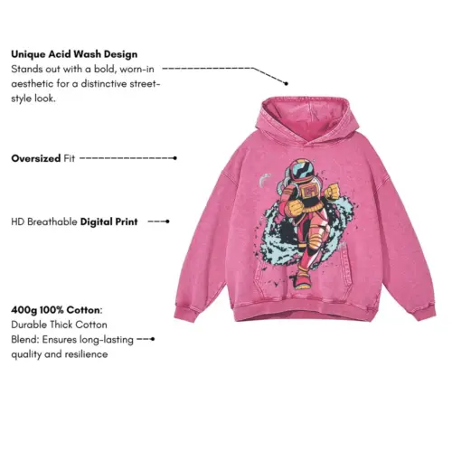 Spaceman Running Acid Wash Oversized Pink Hoodie
