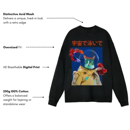 Trippy Cat Astronaut Acid Wash Oversized Long Sleeve Shirt