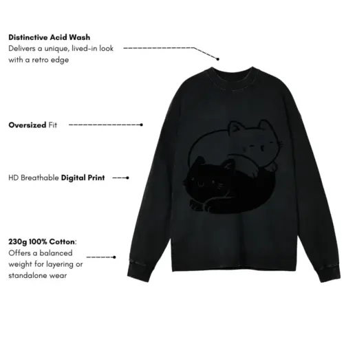 Ying Yang Cats Acid Wash Oversized Long Sleeve Shirt