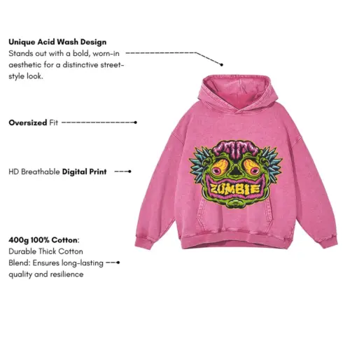Zombie Face Acid Wash Oversized Pink Hoodie